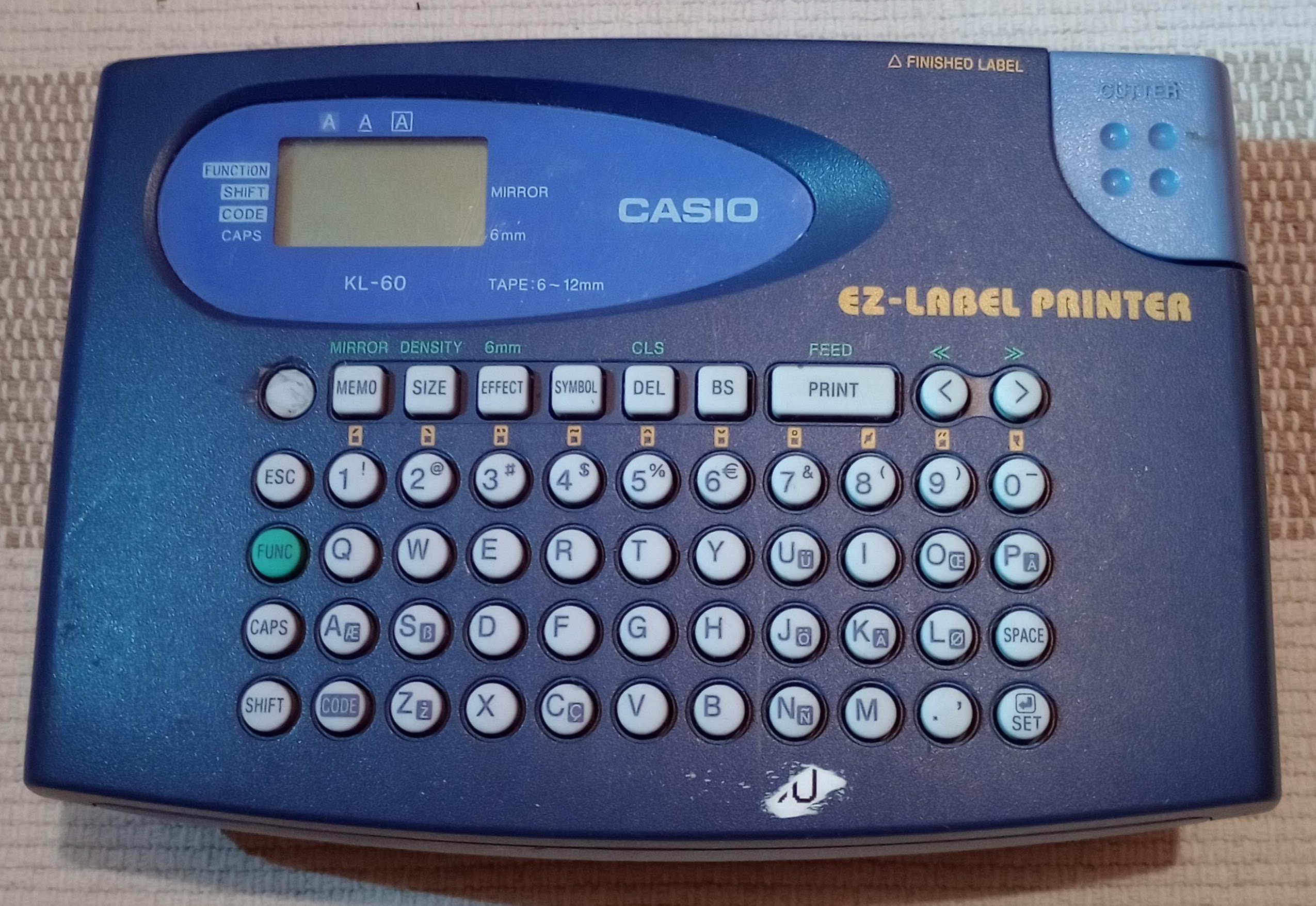 Sprawna, używana, stan jak na zdjęciach. Bez baterii (6x AA), z taśmą biała 9 mm (sporo zostało). Opis i parametry: Drukarka etykiet Casio KL-60, 6 mm – 12 mm KL-60